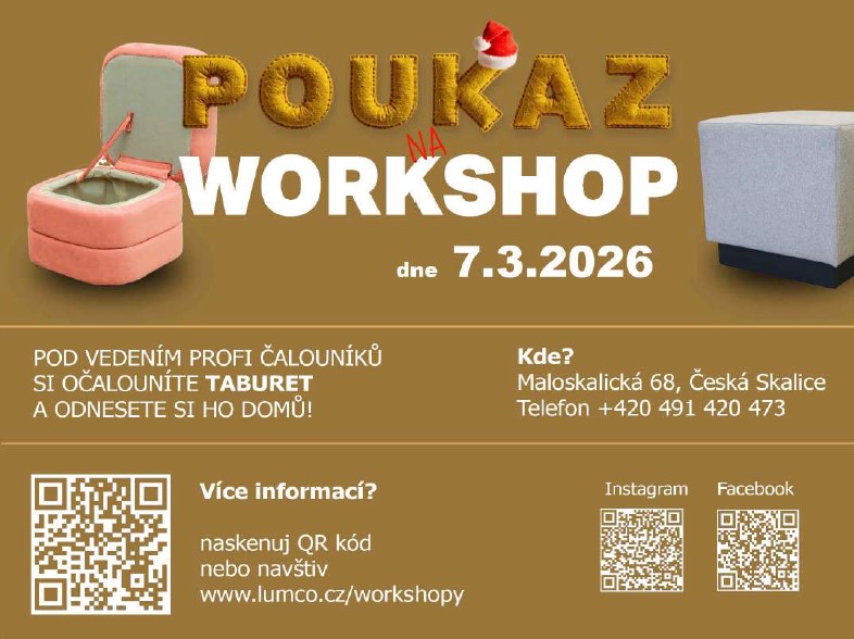 2. cenu – poukaz na workshop výroby taburetu, kde si vyzkoušíte práci našich čalouníků a odnesete si jedinečný zážitek 🎨🛋️